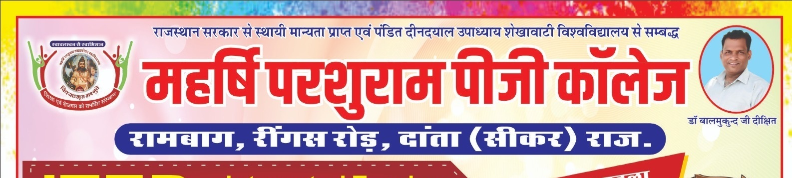 Welcome to Maharshi Parashuram PG College,Danta (Sikar) Rajasthan. This college is affiliated by Pandit Deendayal Upadhyaya Shekhawati University, Sikar and approved by N.C.T.E. Maharshi Parashuram PG College is organised by Late Shri Kanhaiyala Haritwal Shikshan Santhan,Danta(Sikar). This Society was established on 2002-03, with a pious objective of Educational, Social & Economical development of Students. Our College has always strived for excellence. The faculty members have always displayed high degree of education and professional proficiency and have done commendable academic work right throughout. I encourage you to peruse our website and to visit it often.